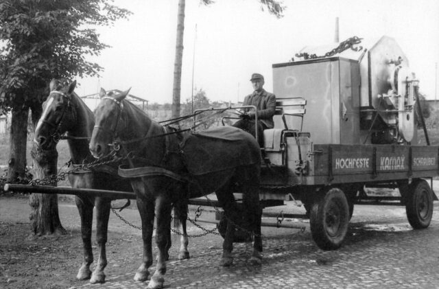 Obrázek z doby, kdy se závod v Osterode při stěhování strojů musel spoléhat na pomoc koní