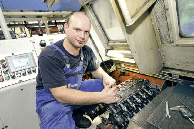 „Můj stroj“ je menší italský lis SACMA 28D. Tento stroj byl nedávno asi měsíc v Německu na generální opravě. Přesto – stejně jako u všech starších strojů – se stále objevují problémy, ale díky vlastní údržbě lze většinu věcí opravit. Na těchto lisech 28 se v KAMAXu vyrábějí šrouby se závitem od M6 do M8 a délce od 14 mm do 65 mm.