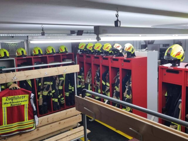 The early and late shifts are always on standby with nine internal firefighters each (a firefighting group); on the night shift there are a further six. As soon as the sirens or the radio alarm receivers go off, the colleagues start moving and report for duty via the regional control center in Göttingen [next bigger town]. “If we can’t handle a situation on our own, we can also call in the volunteer fire department from the city of Osterode, which can support us with a fire engine (21 people),” says Lars Kreiter.