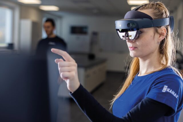 W związku z projektem PPA (Product Plant Allocation), w którym części i całe maszyny są przenoszone po świecie firmy KAMAX, wspólnie z firmą OPEX rozpoczęliśmy pracę nad pomysłem, jak użyć nasze okulary do ułatwienia tych czynności. Korzystanie z tej opcji oznacza dodatkowe oprogramowanie umożliwiające pracę z modelem 3D maszyny, który można rzutować bezpośrednio w obszarze produkcyjnym. Czy powinniśmy nałożyć wizualizację na obecną maszynę, czy umieścić ją w wolnej przestrzeni między innymi maszynami? W ten sposób zainteresowana osoba może wcześniej przetestować dostęp do miejsca pracy i obszaru roboczego wokół maszyny bez konieczności fizycznego przemieszczania przedmiotu.